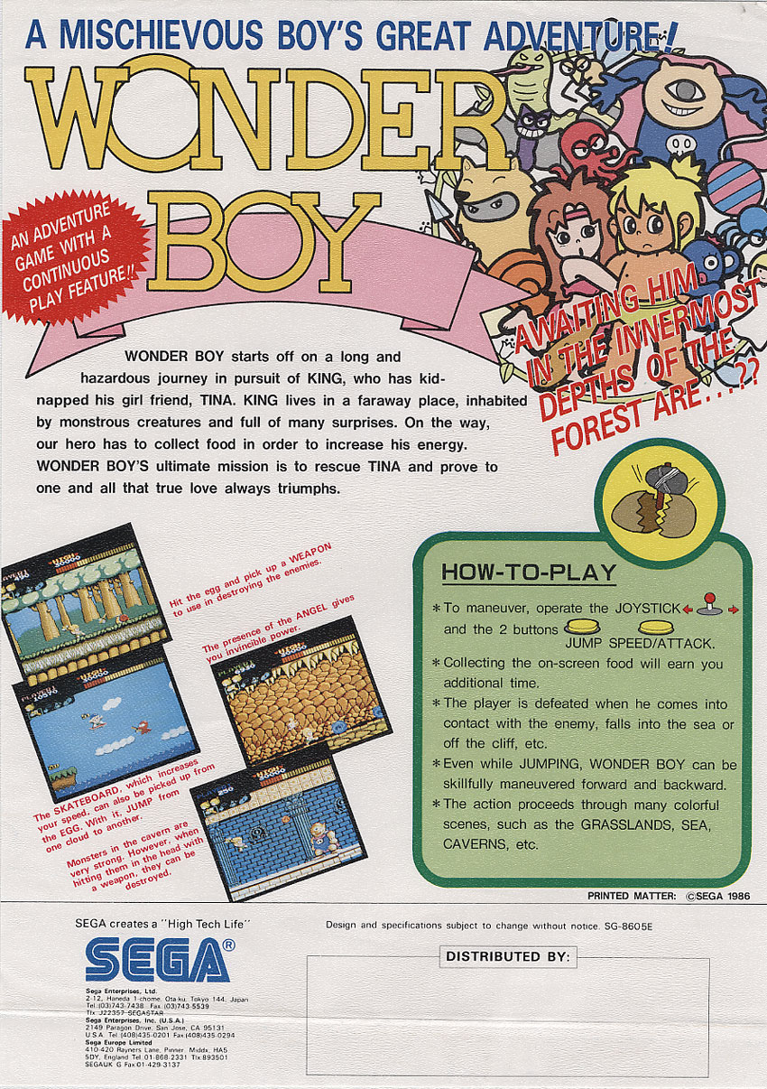 Originally designed for arcades, it was later ported to the SG-1000, Sega Mark III/Master System and Game Gear video game consoles by Sega, and to the ZX Spectrum, Commodore 64 and Amstrad CPC home computers by Activision. The game is also known as Super Wonder Boy (スーパーワンダーボーイ Sūpā Wandā Bōi) for its Sega Mark III release in Japan and Revenge of Drancon for its Game Gear release in North America. It was also adapted as Adventure Island for the NES, MSX, and other systems.
